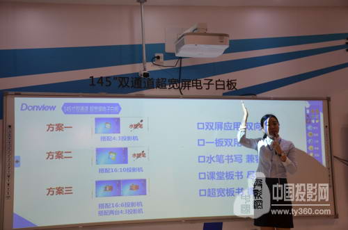 在這里,莫總向我們介紹道:在本次展會上,東方中原帶來了一個特別獨特的方案。顯示方面采用一臺16:6的激光投影機,顯示區域面積高達150寸(寬度約3米多,高度1.2~1.3左右),與傳統的“綠板”面積接近,大小非常符合老師傳統板書的習慣。