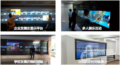 該展項以時間軸視頻圖片瀏覽軟件為主體,采用3臺7000流明的索諾克Sonnoc液晶投影機SNP-FU71C作為顯示媒介,配合半透明鋼化玻璃觸控投影幕(做成“L”造型),組成便捷的觸控瀏覽解決方案,可實現多人同時操作瀏覽,互動性極強,5760*1080 超高分辨率顯示視覺效果極佳。