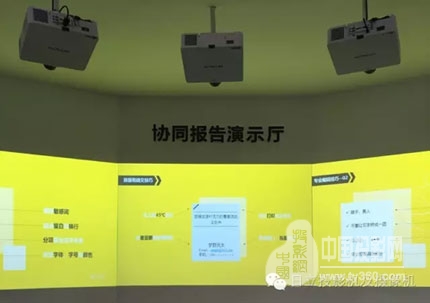 三臺7000流明日立HCP-D877U配合VIS顯示墻互動顯示系統(tǒng),模擬學(xué)校教學(xué)應(yīng)用場景,將PPT以圖片形式導(dǎo)入系統(tǒng)文件夾,用戶通過觸摸進行翻頁操作,并對PPT進行標(biāo)注甩出,可同時多人進行演示。