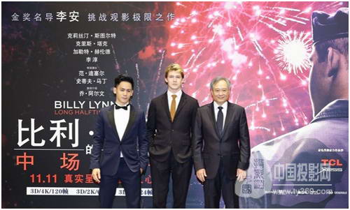 李安導演(右)與喬•阿爾文(中)和李淳(左)出席《比利•林恩的中場戰事》的北京首映會