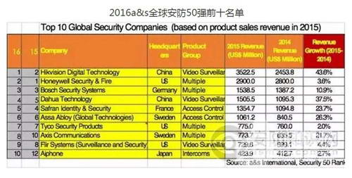 據(jù)了解,一年一度的a&s“全球安防50強(qiáng)”是全球安防產(chǎn)業(yè)的權(quán)威排行榜之一,它主要是針對全球范圍內(nèi)純安防領(lǐng)域的制造商、方案提供商(不包括安裝商)去年年度銷售和營利情況所做的評比,是評估安防企業(yè)在全球市場中實(shí)力和地位情況的重要參考依據(jù)。