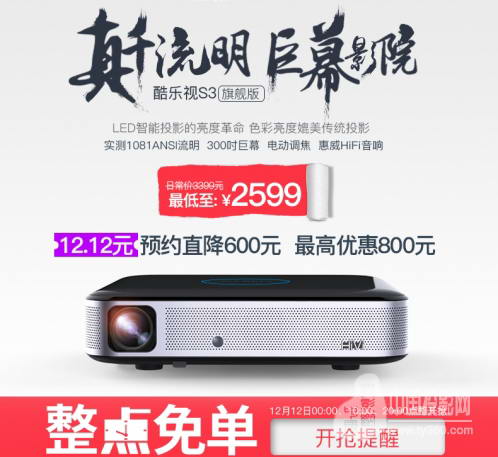 爆款機型一:超千流明新品酷樂視S3,原價3399元,預約抵扣200元、下單立減400元、前3分鐘付款還能返現(xiàn)200元,最高直降800元,到手價即為殘暴的2599元!!!3分鐘后購機贈價值188元的原裝3D眼鏡。當然如果你夠幸運,在12月12日11:00-19:00每個整點前5名付款成功,還能獲贈價值479元100寸16:10電動幕布,更更驚喜的是,如果你是00:00、10:00、20:00點整付款成功的第一名用戶,還將獲得免單購機大獎。另外,酷樂視S3還開啟換購服務,酷樂視Q6系列換購+1999元,酷樂視X6C系列換購+1599元,酷樂視X6系列換購+999元,即可換購;