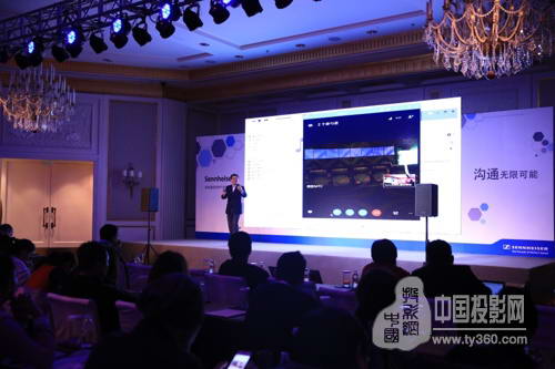 產(chǎn)品演示.jpg: Sennheiser大中華區(qū)技術(shù)經(jīng)理陳子騫向與會(huì)嘉賓現(xiàn)場(chǎng)演示基于Skype for Business平臺(tái),通過(guò)TeamConnect實(shí)現(xiàn)位于上海半島酒店的會(huì)場(chǎng)與位于廣州的微軟技術(shù)中心三方兩地之間的音視頻通話。