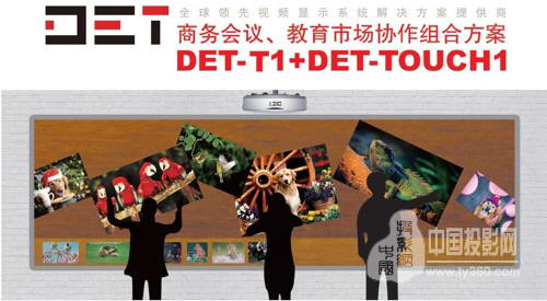 這一套出自DET自有品牌的設備,由超短焦、超寬屏DET-T1激光教育投影機,和134英寸超寬屏觸控電容屏DET-TOUCH1組成。