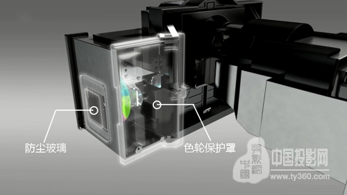 色輪作為DLP投影機(jī)的另一核心組件并沒有包含在DLP光機(jī)內(nèi),如若長期暴露在外難免會(huì)沾染灰塵,明基教育投影機(jī)專門設(shè)計(jì)了防塵玻璃(光路)和色輪保護(hù)罩(側(cè)面),杜絕灰塵沾染。