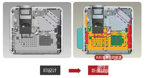 為了使得教室里每個(gè)學(xué)生都能看清投影機(jī)顯示的內(nèi)容,教育投影機(jī)的亮度相較于家用投影機(jī)、商用投影機(jī)要高得多,投影機(jī)燈泡的發(fā)熱也隨之提升。為了穩(wěn)定投影性能,必須提高光源部位散熱能力,考慮到成本因素,教育投影機(jī)往往采用散熱風(fēng)扇。為了提升散熱性能,勢必選擇增大風(fēng)扇尺寸,提高風(fēng)扇轉(zhuǎn)速,增加進(jìn)風(fēng)口面積,而這種解決方法的副作用就是會(huì)引起更多地灰塵進(jìn)入機(jī)身內(nèi)部,導(dǎo)致投影系統(tǒng)不穩(wěn)定。