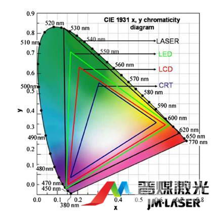 由圖* 可知,RGB純激光光源可以還原、顯示的顏色達(dá)到自然界顏色的90%以上,遠(yuǎn)遠(yuǎn)大于傳統(tǒng)燈泡光源(約60%)。