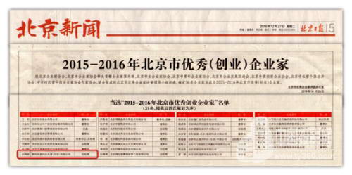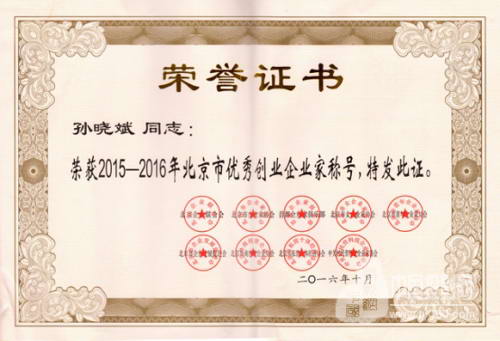 孫曉斌博士榮獲“2015-2016年北京市優(yōu)秀創(chuàng)業(yè)企業(yè)家”獲獎(jiǎng)證書