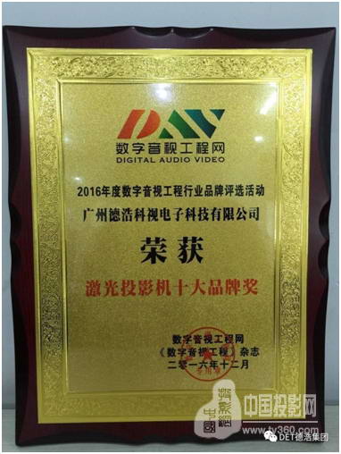 在過去的一年中,DET激光投影機表現優異,不僅完成了西安《12.12》中國第一部大型實景沉浸劇、濟南泉水博物館、首屆中國貴州(隆里)國際新媒體藝術節等大型項目,更榮獲了“2016年度激光顯示設備品牌大獎”、“2016激光投影機十大品牌獎”等多項榮譽。