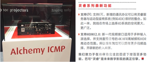 除了新型激光放映機(jī)外,巴可還推出了全新的巴可靈睿系列集成影院媒體處理器 (ICMP) 供客戶選擇。院線可借助新一代 ICMP,直接將外部視頻的“UHD 高端”視頻源連接到放映機(jī),用于多種輸入源選擇。也就是說,院線可以擁有更多視頻選擇。ICMP 亦增加了兩個(gè)額外的 HDMI2.0 接口,同時(shí)保留原有的 HDMI1.4(和 SDI)輸入接口。這樣,用戶便可連接四種不同的視頻源。借助 HDMI2.0 的強(qiáng)大功能,放映機(jī)和服務(wù)器既有的 4K HFR高幀頻和 4K3D 功能,現(xiàn)在可以連接到更多的、新的外部輸入源。