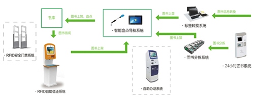 技術,快速識別、追蹤和保護圖書館的所有資料,通過標簽轉換系統、智能盤點導航系統、圖書分揀系統以及安全門禁系統等智能管理手段,完美實現圖書借還、上架、查找、館藏盤點等功能,極大簡化操作流程,降低管理人員勞動強度,全面提高圖書館的管理效率與服務質量。