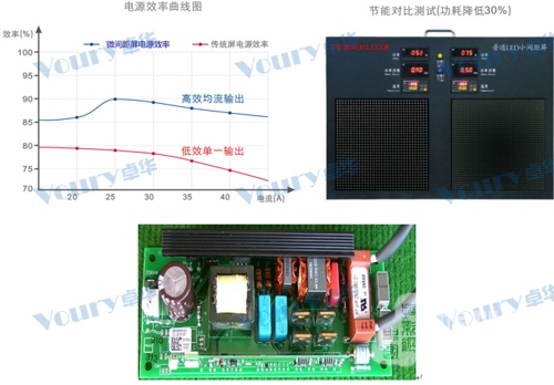 LED顯示屏采用綠色發光技術,光電轉換效率高,節能環保。并采用高效率的PFC功能開關電源為LED供電,開關電源 PF>0.97,把整屏能耗降到最低。