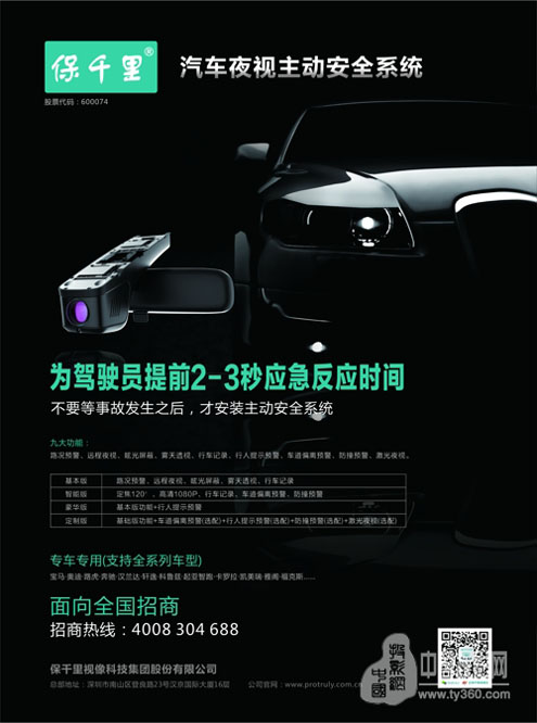 在汽車智能化趨勢明顯的當(dāng)下,保千里以系統(tǒng)的光學(xué)成像技術(shù)、夜視技術(shù)及仿生智能算法技術(shù)為核心,運(yùn)用數(shù)十項(xiàng)自主專利技術(shù),以人性化、個(gè)性化設(shè)計(jì)理念為先導(dǎo),研制推出汽車夜視主動安全系統(tǒng),擁有路況預(yù)警、遠(yuǎn)程夜視、眩光屏蔽、霧天透視、雨天透視、手機(jī)互聯(lián)、行車記錄、行人提示預(yù)警、車道偏離預(yù)警、紅外智能感應(yīng)、激光夜視等智能駕駛功能,并逐步衍生打造出從12V到24V,軍用、警用、民用市場的小轎車、SUV、MPV、大小客車、特種車、危險(xiǎn)品車、防爆車、裝甲車等夜視系統(tǒng)、主動安全系統(tǒng)、智能駕駛系統(tǒng)等全套解決方案,為客戶量身打造基本版、智能版、豪華版、定制版等多種級別配置系統(tǒng),全面實(shí)現(xiàn)客戶安全、時(shí)尚、個(gè)性兼具的消費(fèi)需求,成為汽車后市場商家招攬用戶、提升銷量的招牌配置。