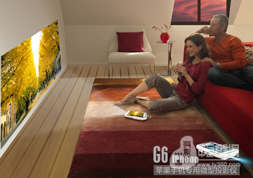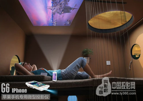 蘋果iphone6系列手機嵌入美高G6微型投影機,立即變成100吋大屏電視,在客廳、在廚房、在廁所、在走廊,看100吋大屏電視。