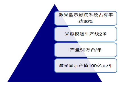 顯示產(chǎn)值達(dá)100 億元/年,產(chǎn)量達(dá)50 萬臺(tái)/年,光源模組生產(chǎn)線2 條, 激光顯示影院系統(tǒng)占有率達(dá)30%,這無疑對(duì)激光顯示產(chǎn)業(yè)是巨大的利好消息。