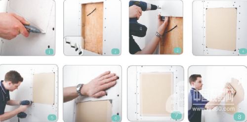 (3)穿透石膏班的前面,用兩個預(yù)制墻的螺絲將支托固定到墻上。