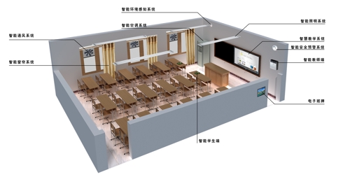 同輝智慧教室方案通過安裝在教室內部的監測設備:PM2.5、溫濕度、二氧化碳、光照度傳感器,煙霧報警器、空調控制器等,對教室環境進行實時監測和數據記錄,并且根據真實環境狀況實現智能控制。比如開啟排風扇降低二氧化碳濃度;光線較暗時開燈,光線較亮時關閉燈光;根據溫度高低自動開關空調;煙霧報警等。