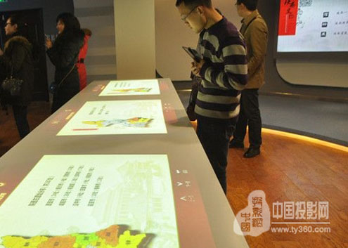桌面互動投影顯示系統(tǒng),主要是為參觀者提供新資料查詢服務。由3臺Sonnoc(索諾克)SNP-EW400C投影機軟融合組成,吊裝豎投,通過軟件和攝像頭采集,參觀者通過手觸桌面的內(nèi)容分類標題,可以查看陜西境內(nèi)所有的歷史文物古跡的名稱、數(shù)量和內(nèi)容簡介,開闊參觀者的歷史知識視野,并對陜西境內(nèi)的歷史古跡進行體系化的宣傳推廣。