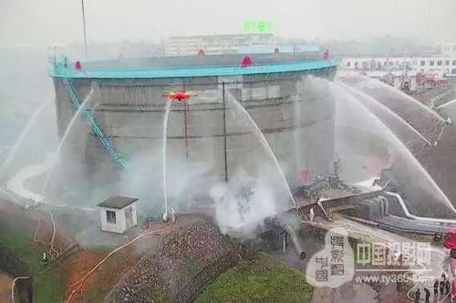 此次消防演練災情模擬為:九江石化原油罐區006號立式浮頂罐,因浮倉腐蝕發生泄漏,罐體遭雷擊并引發密封圈著火。緊接著限位柱產生變形,造成浮盤卡盤,著火罐呈半敞開式燃燒。災情進一步擴大,006號罐浮盤傾覆,呈全液面燃燒狀態,防火堤內產生約500平方米流淌火;饎輰ε徆薨踩珮嫵赏{。著火罐固定消防設施及冷卻水噴淋系統,因流淌火燃燒損壞,災情不斷呈升級擴大趨勢。