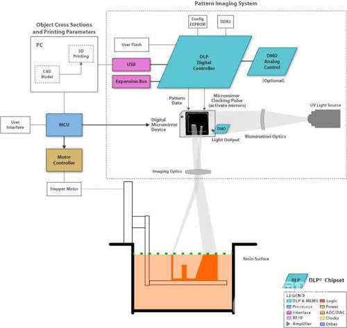 當(dāng)SLA技術(shù)與DLP技術(shù)結(jié)合時(shí),DMD會(huì)由UV光源點(diǎn)亮。然后DMD的像素被分別處理,圖像被投影到樹脂層,從而產(chǎn)生一系列截面,這些截面可組成3D物體。采用DLP技術(shù)能夠帶來多種優(yōu)勢(shì),比如能用光學(xué)技術(shù)使來自DMD的各個(gè)像素成像,而不是讓光源直接在樹脂上成像,這樣可優(yōu)化分辨率和特征尺寸。【圖像1】