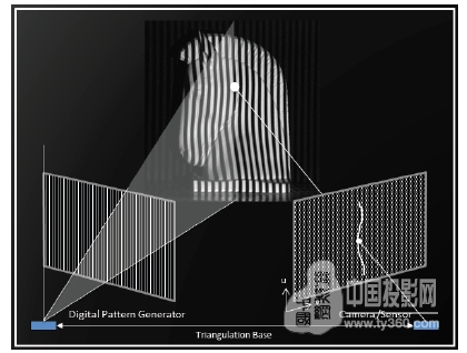 傳統(tǒng)的機(jī)器視覺系統(tǒng)采用接觸式坐標(biāo)測量法或使用單個(gè)攝像頭的非接觸式2D檢測與測量法來掃描物體。DLP輔助的3D機(jī)器視覺系統(tǒng)則可采用單行掃描的變異法 —— 結(jié)構(gòu)光方法。【圖像2】在這里,數(shù)字光圖案被投影到一個(gè)物體上。接著,這些光圖案通過攝像頭傳感器成像——該傳感器可借助已知的光源角度對(duì)數(shù)據(jù)進(jìn)行三角測量,以提取3D信息。