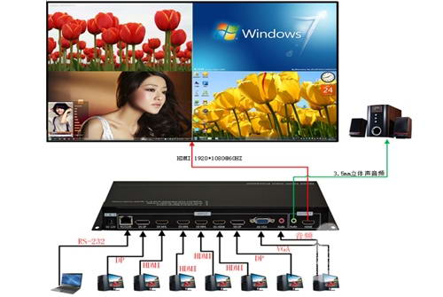 支持音、視頻同步切換功能。其中HDMI和DP內(nèi)嵌音頻信號,VGA外部綁定Audio信號輸入。在放大某窗口視頻信號全屏顯示時音頻信號可跟隨切換,或者四畫面分割模式下獨立切換音頻信號。