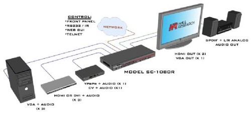 Hall Research新推出了一款超高性價比的多格式切換倍線器SC-1080R,支持(HDMI,VGA,YPbPr和CV)四種不同信號的輸入。SC-1080R可切換和倍線8種AV信號的輸入(包括3*HDMI,3*VGA,1*YPbPr和1 *Composite Video),可同時輸出3個信號(2*HDMI,1*VGA)。信號輸入支持多種PC和HDTV的分辨率(復合視頻輸入支持NTSC和PAL)。PC (VGA 至 WUXGA)或HDTV (YPbPr/YCbCr 從 480i 至1080p)都可以指定輸出格式和分辨率,便捷模擬和數字信號的輸出,獨立模擬和數字音頻的輸出。