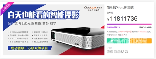 酷樂視S3項目總監謝工表示,本次S3在京東眾籌所取得的成績,并不僅僅是對S3這款產品的肯定和嘉獎,更預示著智能投影市場已經進入了一個相對成熟的階段,很多消費者已經擺脫了小白的階段,對“LED智能投影”這類產品開始深入了解,有些發燒友甚至對產品各項性能、配置,甚至潛規如數家珍,在這一部分“意見領袖”的觀念輿論影響下,人們漸漸對過去不切合實際的廉價性價比感到厭煩,開始追求更高品質的產品。而酷樂視S3在這個時間點出現,從亮度這一最大痛點突破,配置全面提升,獲得超千萬的成績,只能說是在順勢而為之外更多了些用心。