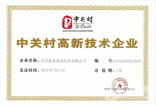 2016年7月15日,北京德普視訊科技有限公司通過中關村科技園區管理委員會審核,獲得“中關村高新技術企業”認證。至此,DEPULL德普視訊在創造具有云標準的大屏幕拼接顯示系統的技術創新方面又有大踏步的邁進,DEPULL對云拼接產品的研發實力在行業內得到進一步認可。
