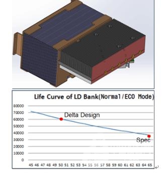 為了達(dá)到與LED光源一樣的超長壽命,免維護(hù),臺達(dá)在設(shè)計(jì)第四代光源(激光)DLP顯示單元時采取針對技術(shù)設(shè)計(jì)。激光光源的壽命與溫度密切相關(guān), 臺達(dá)采用智能散熱設(shè)計(jì)與電流調(diào)整技術(shù),采用了業(yè)界最先進(jìn)的嵌入式真空熱導(dǎo)管散熱技術(shù),縮短熱源,以及更高效率的熱導(dǎo)管及散熱鰭片設(shè)計(jì),精確控制光源溫度,保證光源長期高效穩(wěn)定,保持亮度及色溫恒定;早期色輪是影響激光機(jī)芯壽命的一個環(huán)節(jié),臺達(dá)在色輪設(shè)計(jì)及制造中采用特殊結(jié)構(gòu)、特制材料及電流調(diào)整技術(shù),有效提高色輪壽命,從而提高光源整體壽命,達(dá)到超長60000 小時。