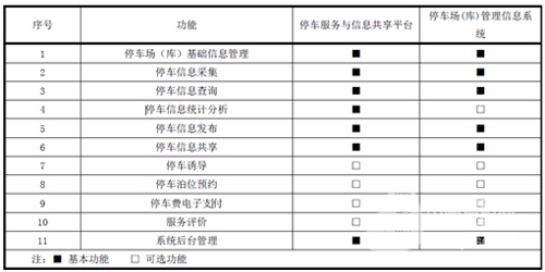 總共包含11項功能,其中停車服務與信息共享平臺包含7項基本功能和4項可選功能,停車場(庫)管理信息系統包含6項基本功能和5項可選功能,場庫系統在完成前端數據的采集、存儲的同時,還需要將相關數據同步到平臺,同時信息的統計分析功能作為可選項。具體功能見表1。