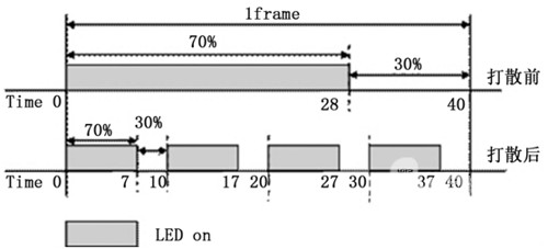 我們知道LED顯示屏幾個核心的部件,如LED開關電源、LED驅動芯片、LED燈珠等,針對LED顯示屏的刷新頻率和灰度等級,LED驅動芯片直接決定了LED顯示屏在視覺刷新頻率、灰度等級的表現。在目前LED驅動芯片之中,最高新的技術為“ScrambledPWM(S-PWM)技術”,S-PWM技術是改進傳統脈波寬度調變(PWM)的技術,其將一個影像導通的時間分散成數個較短的導通時間,以增加整體的視覺更新率。更進一步說明,新一代的LED驅動芯片所內建的S-PWM技術,能將原本每幀(frame)計數一次(LED晶粒ON→LED晶粒OFF)的方式,平均打散成多次計數,且每個打散的等份,皆可維持原先未打散前的On/Off比例,如下圖所示。