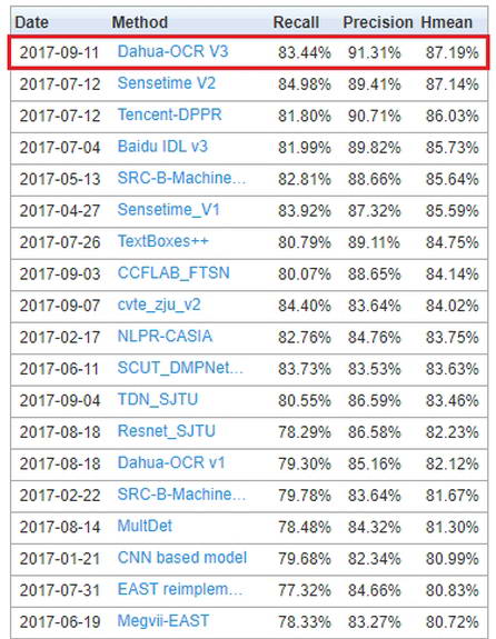 大華股份先進技術研究院,采用深度學習技術研發的文本檢測技術,取得了自然場景隨手拍文本檢測排行榜第一名,標志著大華股份在自然場景文字檢測方面取得了突破性進展,為技術成果落地奠定了堅實的基礎。