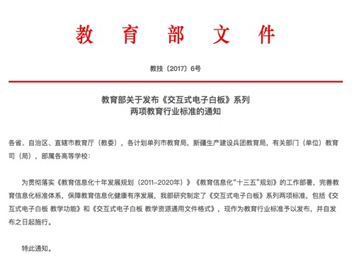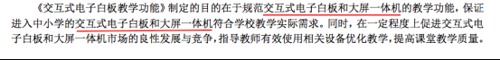 近日,國家教育部發布了教技【2017】6號文件《交互式電子白板》系列兩項教育行業標準,包括《交互式電子白板 教學功能》和《交互式電子白板 教學資源通用文件格式》,旨在更好規范交互式電子白板和大屏一體機的教學功能,保障教育信息化健康有序發展。但業內卻出現一種聲音,將行標中提到的電子白板尺寸要求強加給大屏一體機,引發了許多爭議。