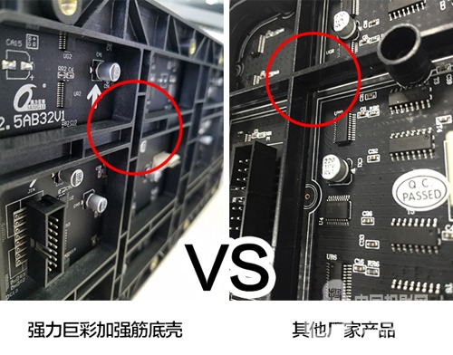 一入手,強力巨彩Q2.5產(chǎn)品相比其他P2.5產(chǎn)品的厚重感讓人欲探究竟。一看便知,同樣采用了縱橫加強筋結(jié)構(gòu)設(shè)計,但Q2.5底殼的壁厚更厚、筋條更粗,整體結(jié)構(gòu)強度更高,不易變形使得整屏拼裝效果更平整。
