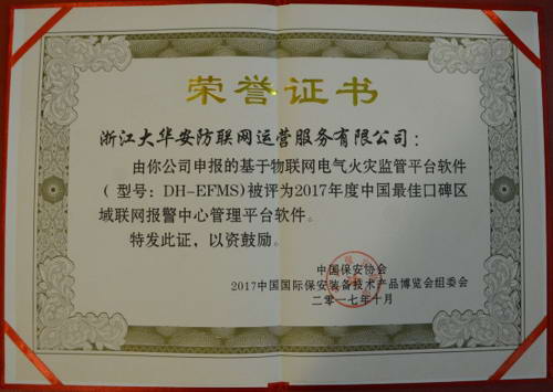 技防應用結碩果,運營服務續新篇。在本屆博覽會頒獎典禮上,大華運營公司繼2015年獲得“第二屆中國報警運營服務優秀企業”之后,再次榮獲“第三屆中國報警運營服務優秀企業”稱號; “DH-EFMS大華基于物聯網電氣火災監管平臺軟件”喜添捷報,一舉摘得“2017中國最佳口碑區域聯網報警中心管理平臺軟件”榮譽。