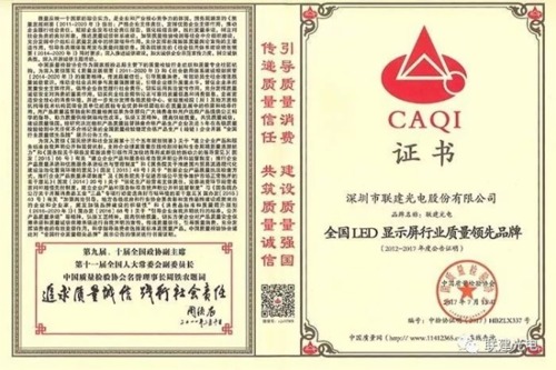 全國“質(zhì)量月”活動是國家長期開展的一項重大質(zhì)量專題活動,今年全國“質(zhì)量月”的主題為“大力提升質(zhì)量,建設(shè)質(zhì)量強國”。中國LED顯示屏知名品牌聯(lián)建光電經(jīng)過中國質(zhì)量檢驗協(xié)會長期跟蹤檢驗,喜獲“全國LED顯示屏行業(yè)質(zhì)量領(lǐng)先品牌”、“全國質(zhì)量誠信標桿典型企業(yè)”、“全國質(zhì)量檢驗合格產(chǎn)品”稱號,這是對聯(lián)建光電LED顯示屏多年堅持在LED顯示行業(yè)打造優(yōu)質(zhì)產(chǎn)品品質(zhì)的贊許,也是對聯(lián)建光電LED顯示屏的認可。