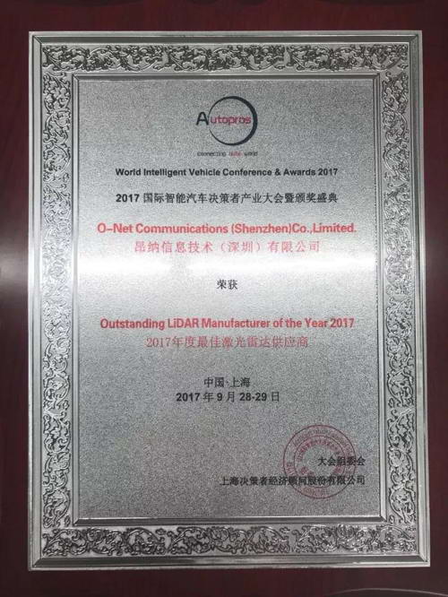 昂納集團一直以來都非常重視新興產業的發展,在智能網聯汽車發展提速、國家支持力度不斷提升的形勢下,堅持戰略上的前瞻部署和技術上的步步為營,始終保持對新興科技的熱度,抓住一切機遇。在2017年9月公開的新一代光雷達產品“PANDA”的發布會上,昂納集團董事會主席兼行政總裁那慶林先生也曾說道:“昂納勢將成為高速增長的先進輔助駕駛系統(ADAS)市場的主要LiDAR技術供應商。”此次在2017國際智能汽車決策者產業大會斬獲的獎項,足以證明昂納在智能汽車行業收獲的認可,我們立志在智能汽車制造行業發展道路上獲得更多的認可和成就!