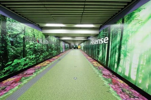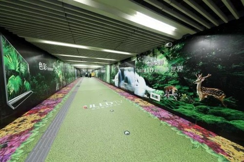 為了讓乘客有身臨其境的體驗,如同海信電視逼真的色彩展示,從梅花鹿到獅子、從鸚鵡到長頸鹿、從森林到陽光……居然把一整個熱帶雨林搬進了地鐵站里。