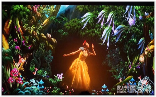 除舞臺基建需求小、不受空間限制等優勢,紗幕投影、裸眼3D等先進多媒體技術更是令互動秀增色不少;有悻F場以紗幕投影呈現3D視覺影像,演員在幕前幕后表演,利用紗幕的通透感,呈現逼真立體之景,形成一種夢幻的虛擬影像。