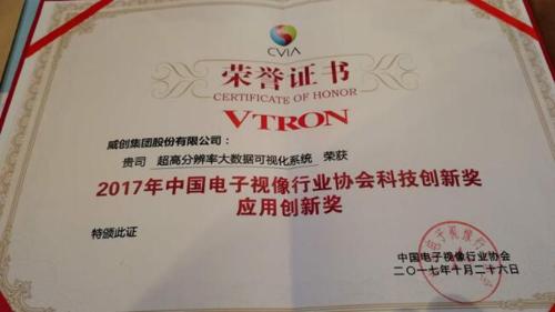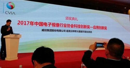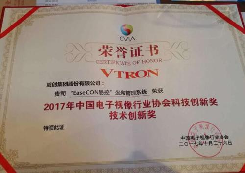 2017年10月26日,在中國(guó)電子視像行業(yè)協(xié)會(huì)舉辦的“2017年中國(guó)音視頻產(chǎn)業(yè)創(chuàng)新獎(jiǎng)”表彰大會(huì)上,威創(chuàng)“超高分辨率大數(shù)據(jù)可視化系統(tǒng)”獲得了年度應(yīng)用創(chuàng)新獎(jiǎng),“‘EaseCon易控’坐席管理系統(tǒng)”也拿下了年度技術(shù)創(chuàng)新獎(jiǎng)。