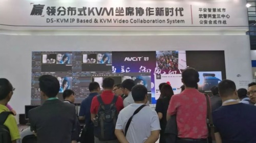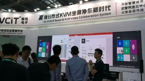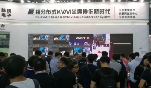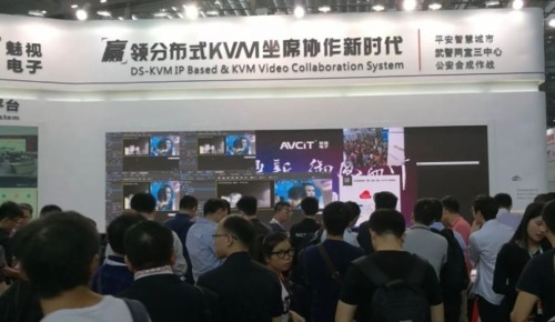 展位現(xiàn)場,DLP大屏滾動播放魅視宣傳片及系統(tǒng)演示視頻,高清小間距LED屏生動展示魅視分布式+KVM坐席協(xié)作系統(tǒng)在公安合成作戰(zhàn)指揮中心、武警兩室三中心、智慧城市 等領(lǐng)域的應(yīng)用解決方案,4K全無縫144*144拼接混插矩陣 全新亮相。