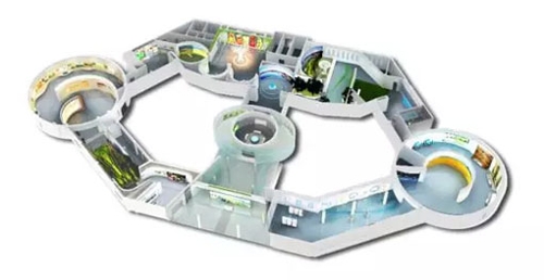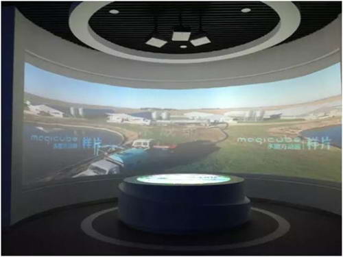 畫面由3臺WX450ST投影機融合而成,用物展示生物能循環(huán)的成果以及如何利用等內(nèi)容,中間圓桌上鑲嵌有顯示屏,顯示屏上方則配置水晶透明模型,以新穎的投影沙盤形式共同演繹農(nóng)業(yè)生態(tài)循環(huán)的過程。