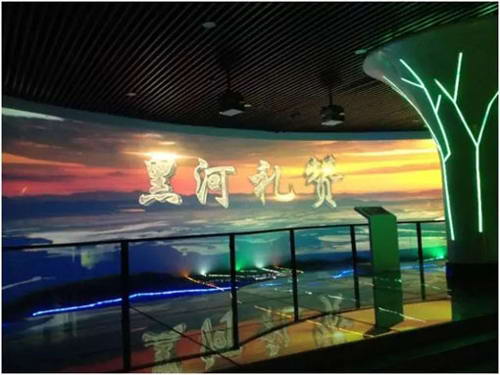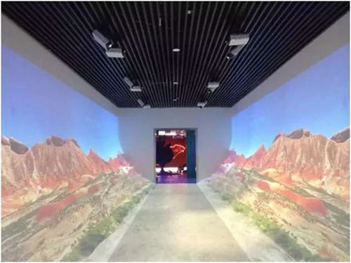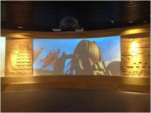 展項由兩側(cè)16臺LCOS超短焦投影機WX450ST和U型弧幕、地面及投影共同組成一個三維空間。投影將在弧幕和地面上投射出張掖優(yōu)美的自然風(fēng)光及獨特的地貌特征,使整個空間效果為之震撼。參觀者步入展廳,恍如置身于張掖美輪美奐的山川景色中,身臨其境的領(lǐng)略與感受這座文明、和諧、繁榮的“戈壁之鄉(xiāng)”。