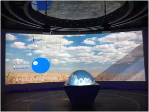水幕代表了張掖潺潺流動的農(nóng)業(yè)之水,投影在水幕上投射張掖相關(guān)的農(nóng)業(yè)水利知識,給人以聲、形、色三位一體的非凡享受。