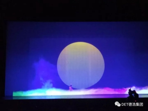 整個舞臺分2套投影系統,正面一道紗幕16*8米,由DET 20000流明 DET-S20K投影; 舞臺背景幕20*9米,畫面由10臺一萬流明SU2 配備超短焦工程鏡頭融合疊加而成,演員在兩道紗幕中表演。