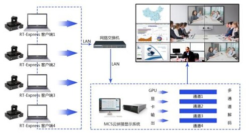 重要領(lǐng)導(dǎo)參與的視頻會議與會商協(xié)作,MCwall輕松實現(xiàn)。RT-express迅屏功能可將筆記本電腦、平板等設(shè)備與視頻會議系統(tǒng)完美結(jié)合,采集基地中分別位于不同房間的8路信號建立實時視頻會議。