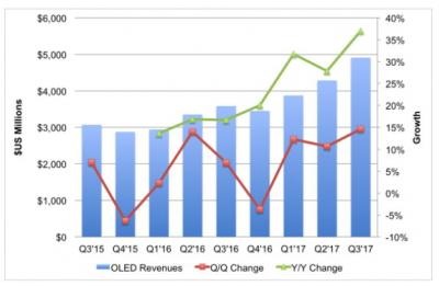低利用率導致OLED營收下降,將2017年二季度下降37%。實際收入增加(如上圖),但剛性OLED面板的定價壓力意味著SDC的OLED營業利潤率由2017年二季度的22.5%下降至三季度的12.4%。DSCC預計,隨著蘋果iPhone X出貨量的增加以及利用率和產量的提高,OLED的盈利能力將迅速回升。對于高成本柔性OLED的更多需求可能使SDC的經營利潤率反彈到20%以上。