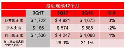 “在過去12個月中,我們通過經營活動所產生的現金流達到48億美元,再次體現了公司商業模式的優勢。自由現金流在過去12個月中達到42億美元,占營業收入的29.0%。