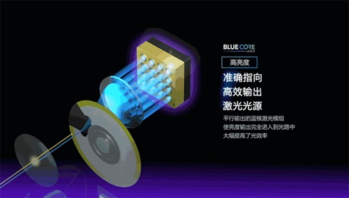 高密度激光模組方面,為提升亮度、促進(jìn)光學(xué)系統(tǒng)小型化,明基用全新模塊化架構(gòu)的激光發(fā)光模組取代獨(dú)立激光單體,提升能量密度,也讓熒光轉(zhuǎn)換后的光線更多地集中到DMD芯片上。